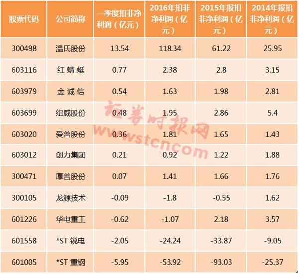 除了*ST墨龙和维格娜丝之外,其余的11只个股当中,*ST重钢、*ST锐电、华电重工和龙源技术4股今年一季度扣非净利润为负值。温氏股份、红蜻蜓、金诚信、纽威股份、爱普股份、创力集团、厚普股份等今年一季度扣非净利润仍为正值,不过对照去年全年净利润的情况来看,均有放缓的迹象。