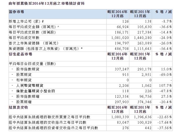 衍生产品市场,2016年的期货及期权平均每日成交量为76.17万张合约,较2015年的76.85万张下跌1%。股市指数期货平均每日成交量为33.72万张合约,较2015年的29.31万张上升15%。人民币货币期货平均每日成交量为2206张合约,较2015年的1062张上升108%。