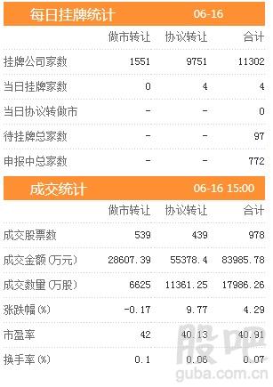 今日新增挂牌企业4家,截至2017年6月16日,挂牌企业总数达到11302家。