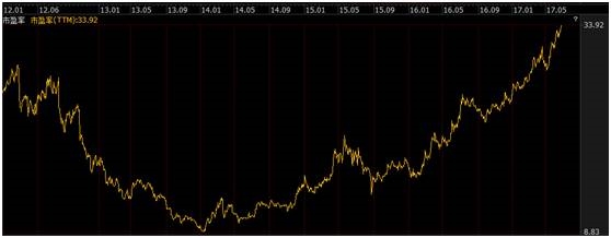 可以看出,尽管已经多年高速增长了,但是这些佼佼者们成长的速度却没有放缓的迹象,净资产收益率(ROE)一直保持在较高水平。因此,尽管股价持续往上攀升,但是随着企业保持着优良增长速度,相关个股的市盈率却长时间保持在低位水平。
