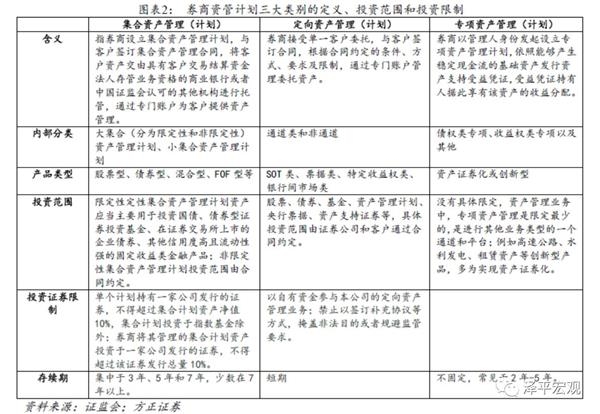 2012年10月,对券商资管业务具有里程碑意义的监管政策相继出台,形成了“一法两规”,即《证券公司客户资产管理业务管理办法》、《证券公司集合资产管理业务实施细则》、《证券公司集合资产管理业务实施细则》的基本体系,通过将集合资管计划的行政审批制改为发行制度,提高了效率,有利于券商根据客户需求及市场情况,灵活设计产品并及时推出;拓展投资范围,在股票、债券、基金、股指期货等证券品种的基础上,增加非上市公司股权、债权资产等;取消小集合、定向的投资比例限制,取消了集合资管计划的最低规模限制。