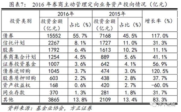 券商资管的资产端以债券和非标投资为主。从投资标的来看,2016年资管产品投向交易所、银行间市场的规模约 5.6万亿元,占比32.6%;投向各类非标资产规模约11.7万亿,占比67.4%。从投资类型看,集合计划以债券投资为主,占比63.2%;定向计划中主动管理定向业务以投资债券为主,占比55.7%,通道业务以投资债券和非标资产为主,占比分别为15.8%和80.0%。