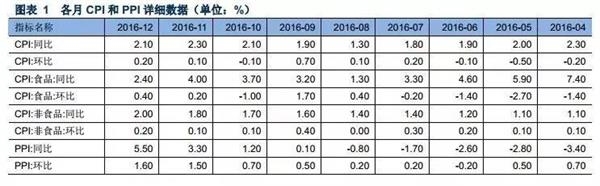 数据显示,2016年12月CPI同比上涨2.1%,连续三个月处于“2时代”,全年CPI同比上涨2.0%。12月PPI同比上涨5.5%,预期4.6%,前值3.3%。