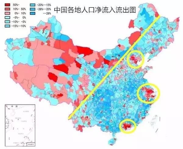 在漠河-腾冲线(黄线)以东地区,蓝色地区面积占主导地位,这意味着大部分城市人口处于流出状态。其中,只有京津、长三角、珠三角经济圈、省会城市和个别经济发达城市例外。