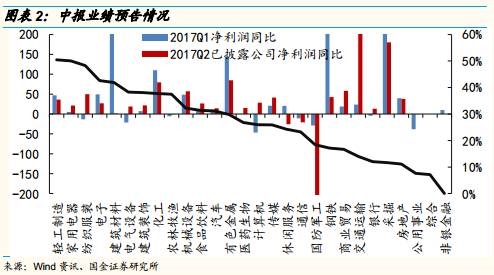 在2017年中报业绩预告披露比例超过30%的行业中,家电、纺织服装、机械设备等行业净利润增速较高且较一季度增速有所加速;轻工制造、化工、有色等行业净利润同比较高,但相比一季度增速有所放缓。