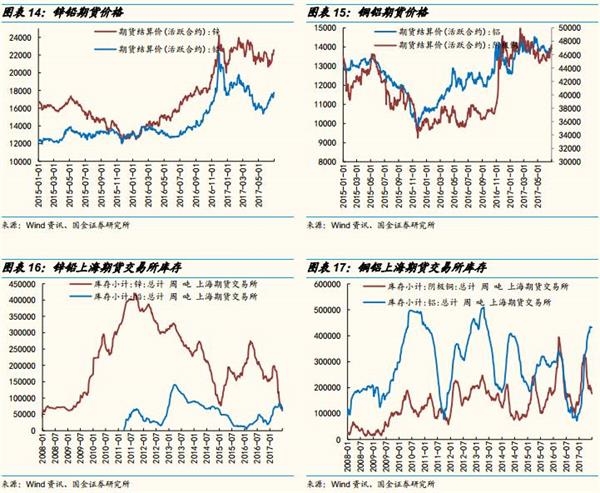 上游:上游大宗商品最近一个月反弹幅度较大,黑色商品表现最强,有色表现次之,表现最弱的原油上周也开始大幅上涨。除了原油外大部分商品库存均先后有所下降,钢铁社会库存从3月开始下降,目前维持低位,有色中锌和铜上交所库存下降较快,煤炭库存自6月开始下滑,这早于之前正常的季节规律。