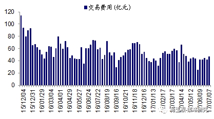 资金流出指标3:交易费用上一周交易费用(包括交易佣金和印花税)为46亿,前一周为41亿。