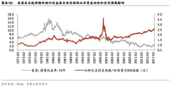 不同于A股,美国成长股能取得持续相对收益,是源于经济结构,而非流动性和信用周期的影响。在2001年科网泡沫之后,美国成长股相对收益(以纳斯达克指数/标普500指数来代表)一路走强,从2001年后的数据来看,纳斯达克/标普500与美国无风险利率的短期波动、金融市场短期利率、期限利差、信用利差的关系均不显著,反映成长股持续的相对收益并不太受信用周期和流动性周期的影响。A股成长股的大周期,仍有待经济结构的转型。