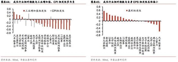 从成长性行业相对收益与行业自身EPS的相关性看,多元金融、影视动漫等的相对收益与自身EPS有正相关性,汽车服务的相对收益则与自身EPS显著负相关,多数电子细分行业的相对收益则与行业自身EPS相关性较弱。