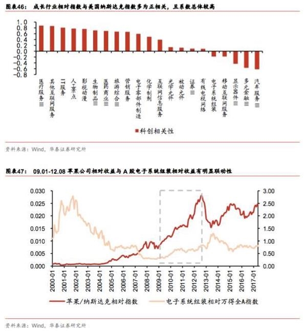 部分相关性较弱的电子细分行业,如电子系统组装等,与纳斯达克成分股苹果公司的相对收益相关性较高:苹果公司2009.01-2012.08期间相对纳斯达克指数表现突出(相对收益533.53%),在此期间A股电子系统组装、光学元件等成长行业同样表现优异,录得相对万得全A超额收益222.09%、176.61%,且均位列三级行业涨幅榜前十。