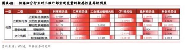 传媒、电子、医药生物一级行业下具有多种细分成长性子行业,对三维外部变量,存在较明显的结构性差异。传媒成长子行业中营销服务利率敏感度最低,而互联网信息服务利率敏感度相比其他子行业要高;影视动漫盈利敏感度相对较高,移动互联网服务盈利敏感度则偏低;其他互联网服务、影视动漫、营销传播与科创周期相关性更高。