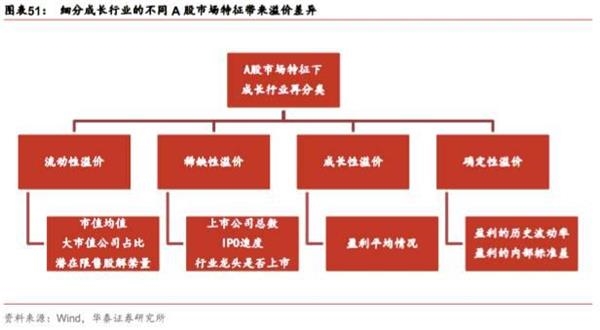 在不同的外部宏观环境下,市场资金追求不同的溢价:成长性溢价、流动性溢价、确定性溢价、稀缺性溢价等等,不同的溢价受行业的A股市场特征影响:大市值公司的占比、市值均值、潜在限售股解禁量等带来细分成长行业的流动性溢价差异;行业内上市公司总数量及IPO速度、行业龙头是否在A股上市等带来细分成长行业的稀缺性溢价差异;行业内上市公司盈利平均情况带来细分成长行业的成长性溢价差异;行业内上市公司盈利的历史波动率和内部标准差带来细分成长行业的确定性溢价差异。
