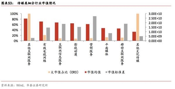 传媒:总体来看,传媒行业中其他互联网服务的流动性溢价最低。从市值角度看,目前行业内市值均值最大的是其他互联网服务和有线电视网络,市值集中度(CR3)最高的是其他互联网服务和其他文化传媒。其他文化传媒、移动互联网服务的市值均值最小,影视动漫、营销服务、互联网信息服务的市值集中度相对较低,营销服务行业内公司的市值标准差最大。