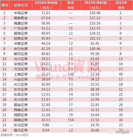 Wind资讯数据统计显示,45家主流券商2016年合计实现净利润759.21亿元,相比2015年,榜单前三名均未变化,分别是中信证券(71.03亿元)、国泰君安(67.64亿元)和海通证券(56.96亿元;此外,国信证券、招商证券等18家券商净利润超过10亿元;另有3家券商业绩出现亏损。