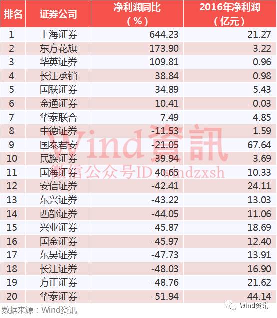 净利润增速居前的基本都是中小券商,其中上海证券2016年全年净利润增速达644.23%位居首位,东方花旗和华英证券紧随其后,净利润均实现了翻番。
