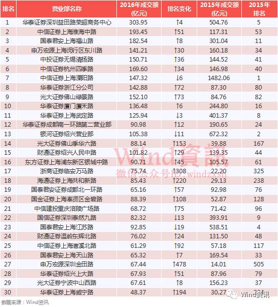 中信证券上海淮海中路、国泰君安上海福山路营业部位列二、三位,2016年全年成交金额分别为193.45亿元和182.54亿元;排名较2015年分别上升51位和9位。