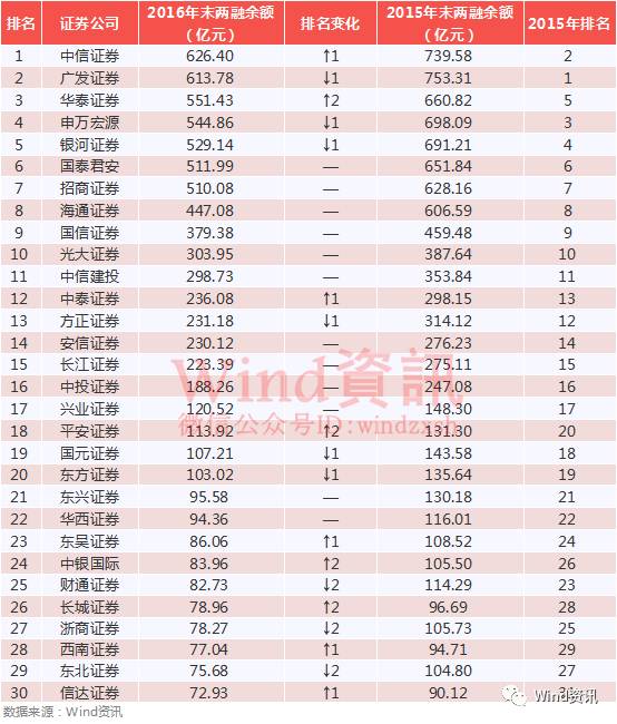截至2016年末,两融余额规模排名前十的券商分别为中信证券、广发证券、华泰证券、申万宏源、银河证券、国泰君安、招商证券、海通证券、国信证券和光大证券,两融余额均超过300亿元。