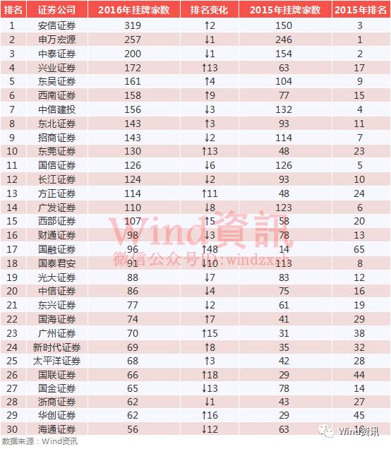 2016年全年,新三板主办券商合计完成5703家企业的推荐挂牌业务,为新三板挂牌数量“爆发”的一年。其中安信证券全年承办了319公司挂牌,位列第一,较2015年排名上升两位。