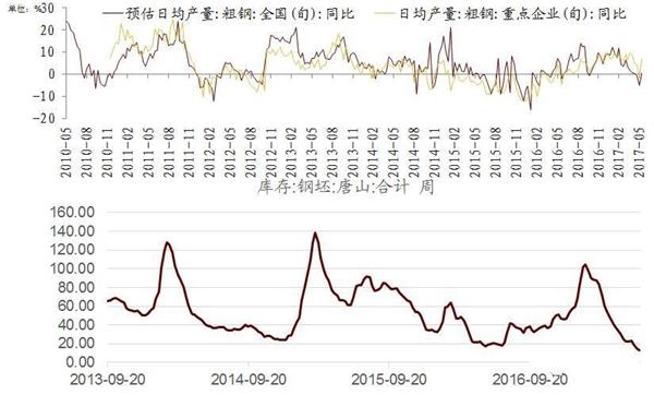 但是,进入到4,5月份之后,施工淡季过后,去年的50万亿固定资产投资,今年年初已经进入计划施工,开始陆续真正进入施工期了,需求开始明显提升。而产量却下去了,所以,库存以飞快速度开始降低,马上就创了历史新低。当然,供给侧改革措施限制了产量快速扩张,于是,大宗商品价格开始出现报复性反弹。