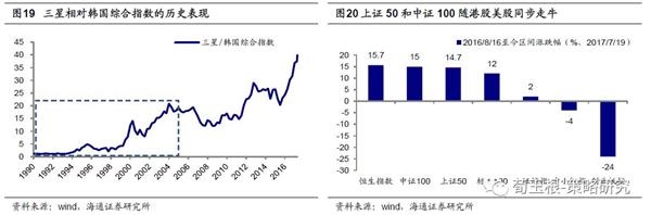 16年下半年来,A股价值和成长风格裂口不断拉大源于盈利趋势和投资者结构变化,国际化强化此趋势。台湾、韩国历史经验显示,资本市场中外资占比提升阶段,价值股、大盘蓝筹股表现更佳。我们前期报告《盈利趋势决定风格-20170625》分析指出,市场风格主要取决于盈利增速趋势、投资者结构。而资本市场国际化则主要影响了投资者结构。台湾、韩国市场国际化阶段,散户成交占比降低,机构、外资成交占比上升,市场投资风格更加理性。17年以来大盘蓝筹股继续大涨,A股漂亮50走出独立行情,上证50、中证100指数走出牛市形态,投资者结构的变化也是重要原因。前期报告《谁在买漂亮50<span style="“margin:0px;padding:0px;max-width:100%;font-family:楷体_gb2312;box-sizing:border-box" !important;word-wrap:break-word="" !important;“-20170629》中分析过,从配置资金角度来看,a股漂亮50的买盘来自公募和陆港通北上资金。统计17年以来陆港通北上资金买入金额前二十大个股,其中主要是以海康威视、美的集团、格力电器、中国平安等为代表的国内大盘蓝筹股。a股国际化加速背景下,将吸引更多外资配置a股。17q1的qfii重仓股行业占比显示,qfii在a股更偏好银行、食品饮料、家电、电子元器件等行业。a股国际化加速的背景下,估值和业绩匹配的大盘蓝筹股更受益。