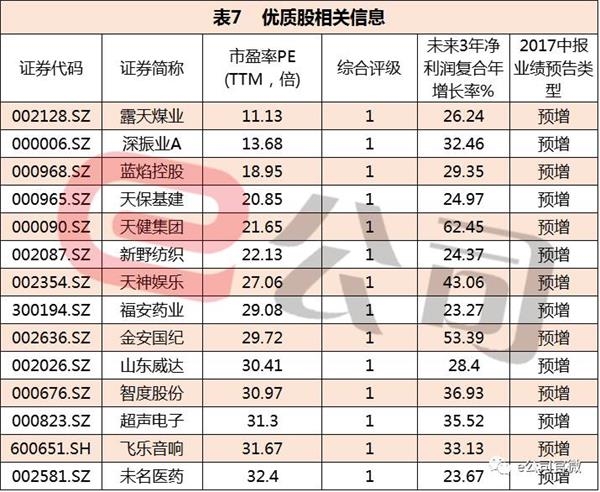 从长期来看,只有追求“价值投资”才能真正把握住好股票。据此,笔者根据未来三年净利润复合增长率大于20%,且市盈率小于50倍,机构综合评级为1(评级为1建议买入),且2017年中报业绩预告为预增的四个条件筛选出来32家企业(表7).