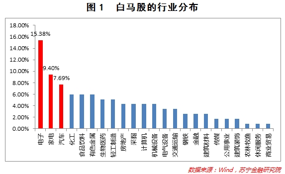从行业分布来看,样本中的大白马主要集中在电子、家电、汽车这些行业里(以样本中这些行业占全部样本的比例表示),其中电子行业尤为突出——在117支白马股中,电子行业的股票占比超过15%。