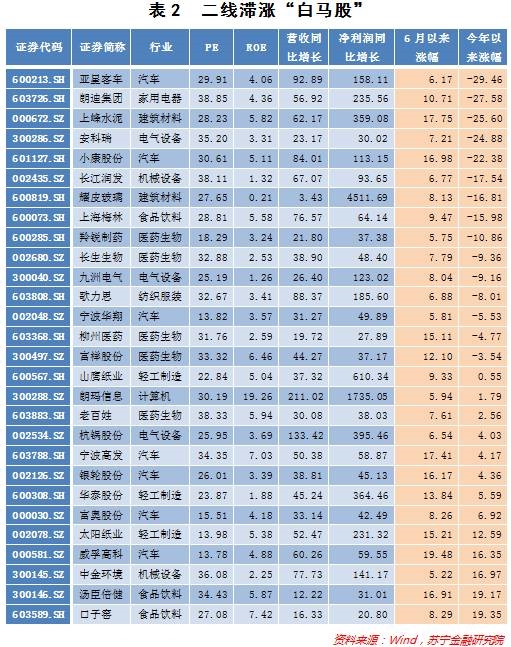 接下来,为了选出目前仍然滞涨的白马股,我们在这188支股票中筛选从年初到现在涨幅不高(不高于均值23.36%,代表年初至今滞涨的二线白马)、6月涨幅较高(不低于5%,说明已经初步启动,得到了市场的关注)的股票28支,参见表2.