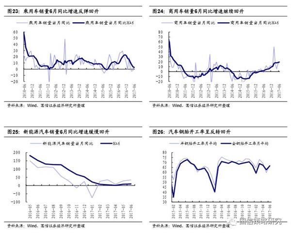 商用车延续涨势,乘用车、新能源反弹回升.6月乘用车销量同比增2.7%,较上月提高5个百分点,呈现明显的筑底回升态势。商用车销量6月同比增速18.7%,同比增速高于上月。新能源汽车5、6月份表现出色,销量同比增速28.6%、34.1%,扭转了自2016年5月以来销量同比增速呈连续下降的趋势。代表潜在需求的钢胎开工率也呈现触底反弹趋势,说明受益于经济向好和消费回暖,汽车产业潜在需求正进一步扩大。