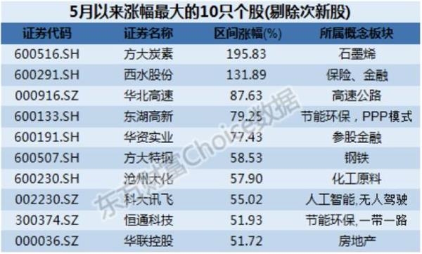 5月以来,又一批穿越牛熊的大牛股崛起,方大炭素、西水股份、华北高速、东湖高新、华资实业等是其中的典型代表。