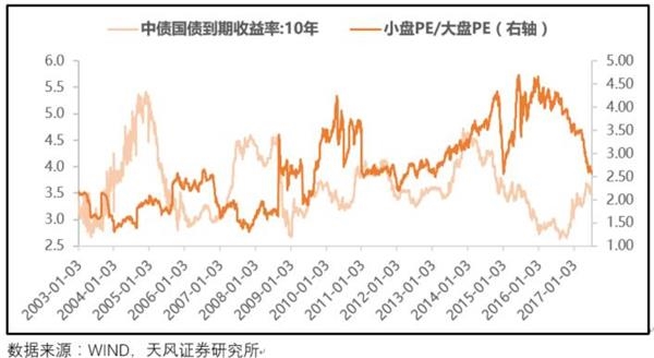 我们通过小盘股PE与大盘股PE的比值来区分风格的变化,用10年期国债收益率来表示无风险利率的绝对水平。两者表现出了非常明显的负相关性,即当无风险利率下降的时候,小盘股PE相对大盘股PE上升更快。相反,当无风险利率上升的时候,小盘股PE相对大盘股PE下降更快。从前几天金融工作会议透露出的强监管信号和下半年经济的腾挪空间来看,下半年的利率至少还处于一个易上难下的阶段里,在看到利率趋势性向下的迹象出现之前,成长股估值趋势性修复的机会几乎渺茫。