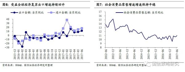第二,固定资产投资总量增速回升,制造业和房地产开发投资增速在回升,基建投资增速缓慢回落。市场之前对于2017年经济下行的担忧主要来自基建和房地产投资下行带来的固定资产投资增速潜在下行冲击。但从现在的情况来看,上半年基建投资累计增速16.9%,基建增速下行的非常缓慢,甚至16.9%的增速还是要高于2016年全年15.7%的增速。而房地产开发投资增速上半年累计同比8.5%,比去年全年提高1.6%,仍在回升过程中;制造业投资增速上半年累计同比5.5%,比去年全年提高1.3%。
