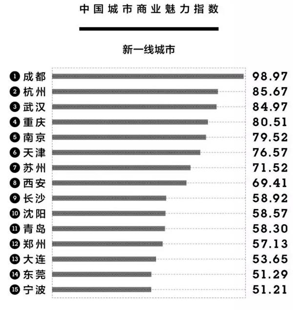 根据《第一财经周刊》今年5月底的报道,第一财经·新一线城市研究所依据大量最新的城市大数据,对中国338个地级以上城市再次排名,并发布了《2017中国城市商业魅力排行榜》。结果显示,北上广深4个一线城市的地位依然不可动摇,15个第一财经新一线城市的席位依次是成都、杭州、武汉、重庆、南京、天津、苏州、西安、长沙、沈阳、青岛、郑州、大连、东莞和宁波。