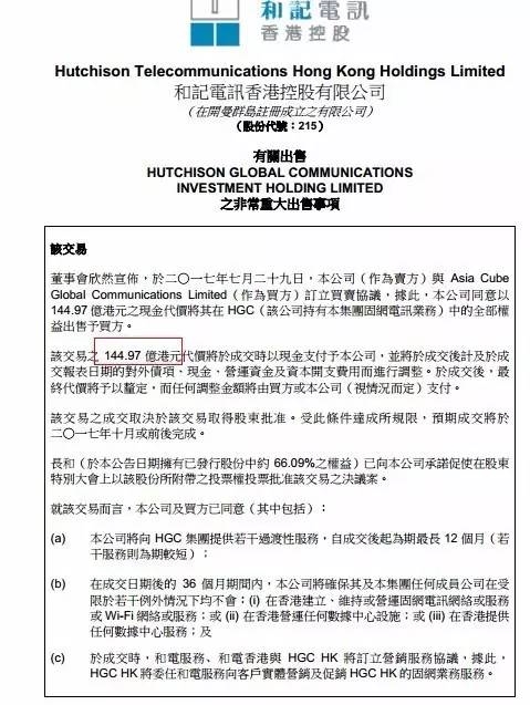 7月29日公司与Asia Cube Global Communications Limited订立买卖协议,以144.97亿港元现金的价格向后者出售旗下和记环球电讯有限公司(以下简称和记环球电讯、HGC)全部权益。