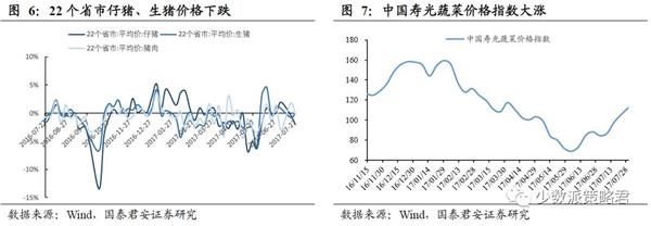 本周猪肉价格下跌,鸡肉价格微涨,蔬菜大涨。(1)7月21日至7月28日,猪肉价格方面,22个省市仔猪价格环比下跌2.0%(上周下跌0.4%),生猪价格环比下跌0.1%(上周下跌1.6%),猪肉价格下跌0.2%(上周上涨1.7%);(2)7月21日至7月28日, 36城市平均鸡肉零售价为10.60元/公斤,环比上涨0.09%。(3)7月23日至7月30日,中国寿光蔬菜价格指数环比上涨至112.01,大涨6.56%,稳步反弹。