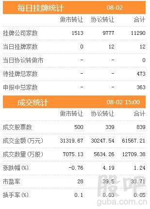 昨日新增挂牌企业12家,挂牌企业总数达到11290家,做市转让1513家,协议转让9777家,待挂牌总家数473只,申报中总家数达到363家。