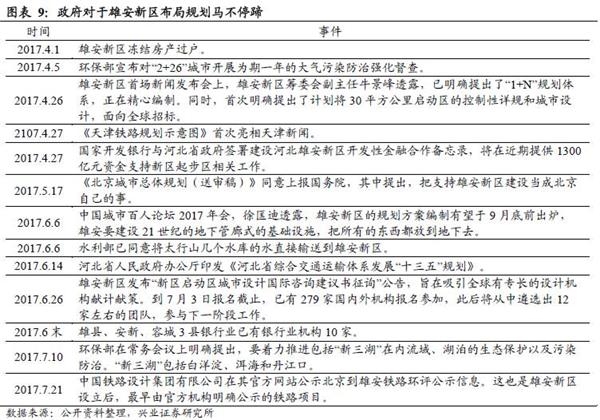 雄安新区建设启动渐行渐近。政府自雄安新区设立以来,召开大大小小会议,发布各种文件,从4月1日的冻结房产过户,到7月10日环保部将白洋淀纳入“新三湖”,明确提出污染防治,一直在马不停蹄推进雄安规划。4月26日,雄安30平方公里启动区设计全球招标,据中国城市百人论坛2017年会上,京津冀协同发展委员会组长、中国工程院名誉主席徐匡迪介绍,起步区30平方公里内将基本没有工厂和建筑物,所以起步区的动拆迁问题很小。展望未来,9月底前雄安规划方案出炉、配套支持文件公布以及雄安建设正式施工等将成为重大催化剂。