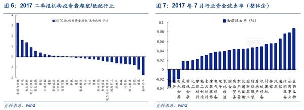 机构仓位方面:根据2017Q2机构投资者行业配置情况(增仓/减仓),非银行金融(+3.26%)、家电(+1.61%)、食品饮料(+1.38%)、电子元器件(+0.90%)和有色金属(+0.54%)等行业超配比例较大,基础化工(-1.70%)、建筑(-1.22%)、医药(-0.78%)、轻工制造(-0.71%)和计算机(-0.68%)等行业低配比例较大。