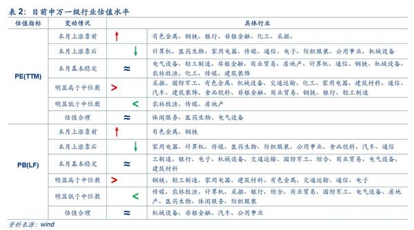 目前申万一级行业PE(TTM)明显高于中位数的行业有采掘业、国防军工,有色等;明显低于中位数的行业有农林牧渔、传媒、房地产等。