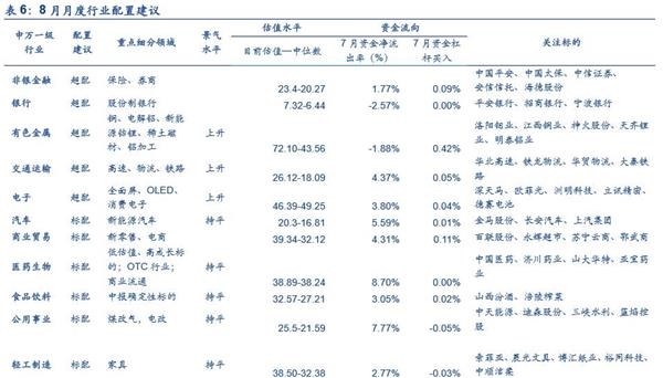 2. 8月行业配置建议:关注新能源车、交运、金融和电子