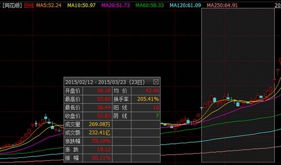 2015年2月12日至3月23日,同花顺股价上涨了55.1%,同期创业板指上涨20.93%,两者偏离幅度达34.17%。