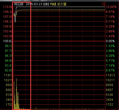 以2015年3月23日为例,相关账户利用资金优势,制造出股价开盘上涨的走势,吸引其他投资者跟风买入,该股开盘后不久直接封上涨停板,违法主体却悉数卖出了全部所持股票,潇洒获利离场。该日的股价走势和操纵情况见下图: