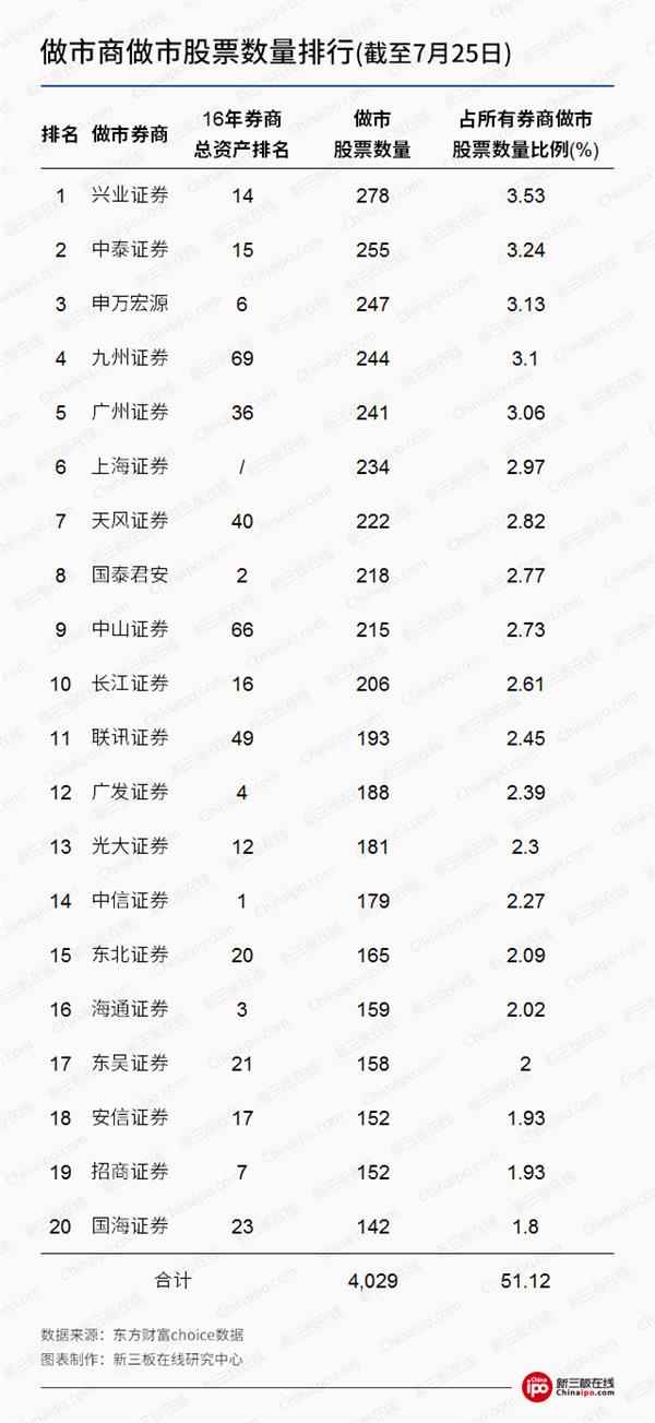 根据东方财富choice数据,截至7月25日,兴业证券做市股票共278只,参与做市数量排名第一,其中可查询到的库存股共150只,合计持有9,740万股,约合市值7.45亿元。