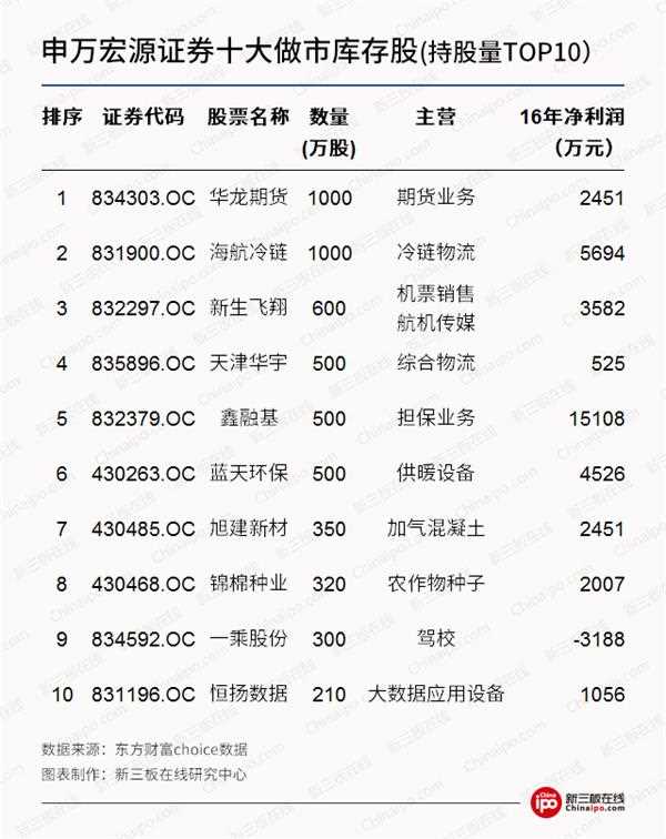从申万宏源的持仓结构来看,与中泰证券一样没有明显的行业偏好,不过论及标的公司的盈利情况,申万宏源和中泰证券的选择似乎更加稳健,两者的十大做市库存股中2016年净利润大于2,000万元的均占7家,相比之下兴业证券的选择就显得更大大咧咧一些,兴业证券的十大做市库存股中净利润不足2,000万元的公司有6家。