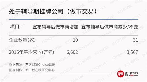 为了验证做市商对集邮概念股的兴趣,新三板在线研究中心做了一个测试,我们以宣布上市辅导日期作为分界点,看一看前后做市商增减变动的情况。我们共选取了41家处于上市辅导期的挂牌公司(做事交易),大多数企业在宣布上市辅导后,做市商没有变化或者有所减少,而增加做市商的企业只有10家,不到采用做市转让企业的四分之一。