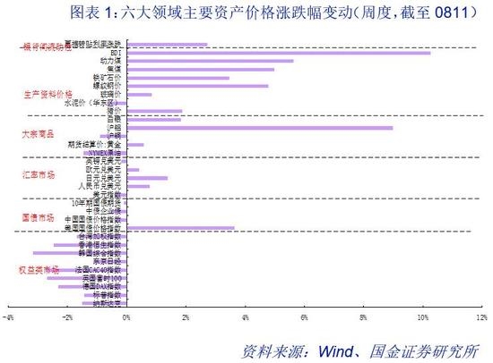 地缘政治紧张近期有所升温,原油价格下跌,投资者涌向避险资产。就朝核问题,美朝近期“口水仗”不断。此前,朝鲜称,正考虑将“关岛”作为导弹袭击目标;8月10日,特朗普则发言:如果朝鲜再对美国采取任何行动,他们应该感到紧张。地缘政治紧张,使得NYMEX原油期货周跌幅-1.47%,收至48.79美元/桶;投资者涌向避险资产,如“黄金、美国国债、日元”等。现货黄金周涨幅+0.58%,升至两个月高位;美国10、30年期国债收益率均创六周新低。日元走高,日元兑美元周涨幅+1.37%。人民币延续升值通道,周涨幅+0.77%,达6.66,人民币汇率升至2016年9月下旬时的水平。