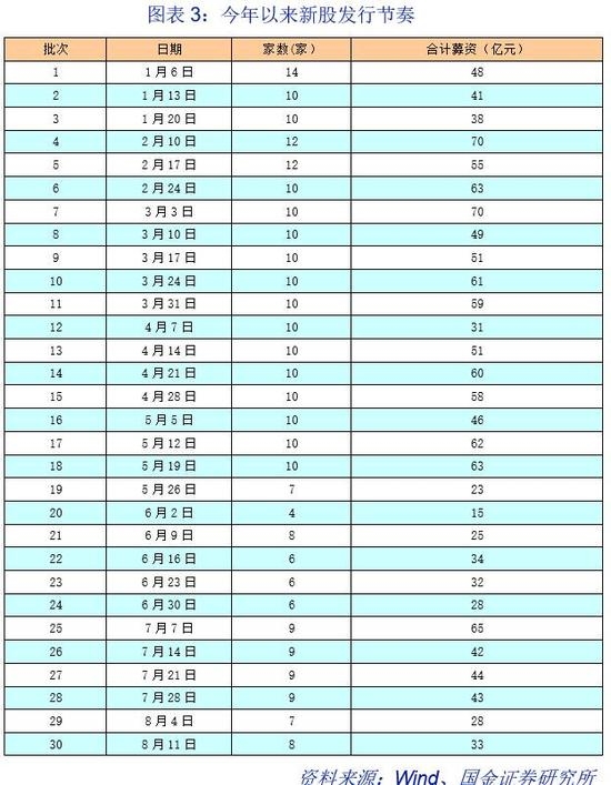 本周末(8月11日),年内第30批新股批文如期下发,发行8家新股,筹资额不超过33亿元。由此,截至8月中旬,年内新股发行共276家,募资金额1388亿,已经快接近了去年全年的发行家数、募集总额。无论是近期召开的全国金融经济工作会议,还是全国证券期货监管系统年中监管工作座谈会,均强调了“服务实体经济是金融的天职,把直接融资放到更重要的位置上,保持首次公开发行的常态化”。