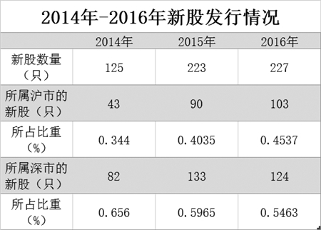数据统计,2016年,A股上市的新股总共有227只,其中,沪市103只,深市124只;2015年,223只新股,其中,沪市90只,深市133只。而2014年,上市的新股共有125只,其中,沪市43只,深市82只。