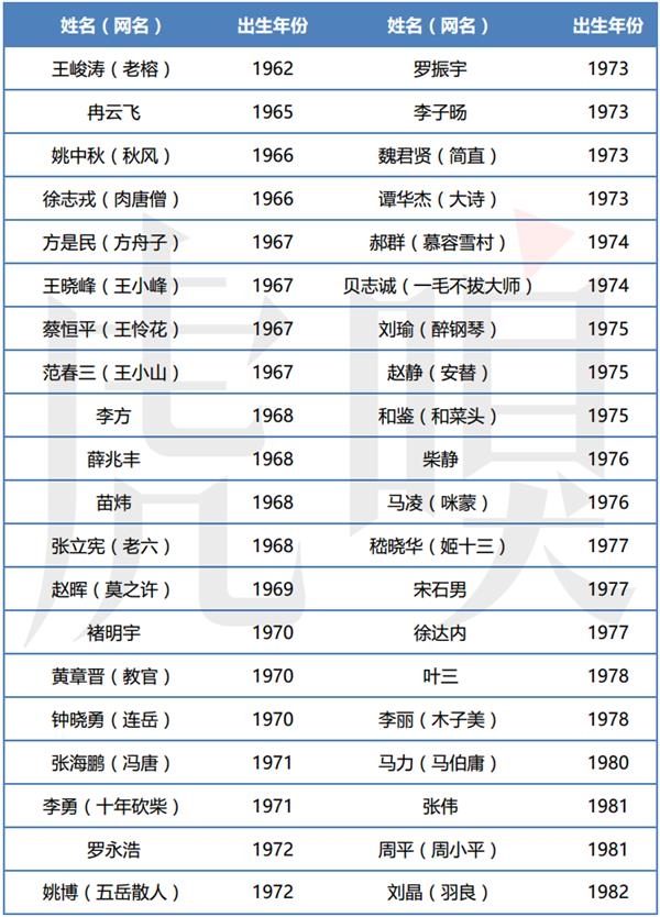 除了个别的80后之外,这40人中有30人出生于1967年至1977年这十年间,占据绝对多数。有趣的是,这些“4050人群”中的不少人直至今日,还霸占着中文互联网的表达空间不放手。