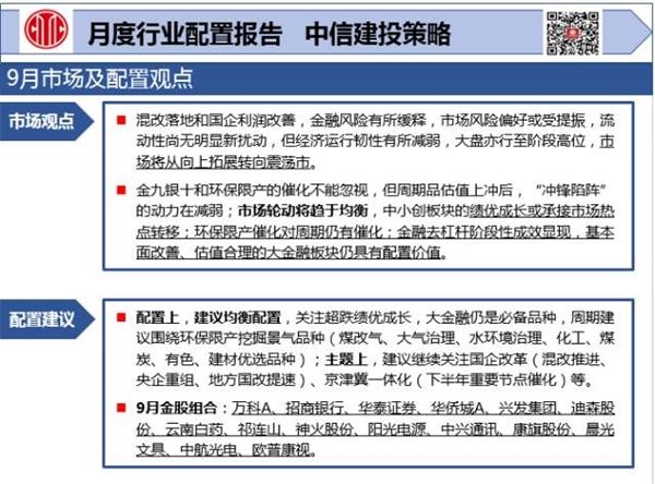 金九银十和环保限产的催化不能忽视,但周期品估值上冲后,“冲锋陷阵”的动力在减弱;市场轮动将趋于均衡,中小创板块的绩优成长或承接市场热点转移;环保限产催化对周期仍有催化;金融去杠杆阶段性成效显现,基本面改善、估值合理的大金融板块仍具有配置价值。