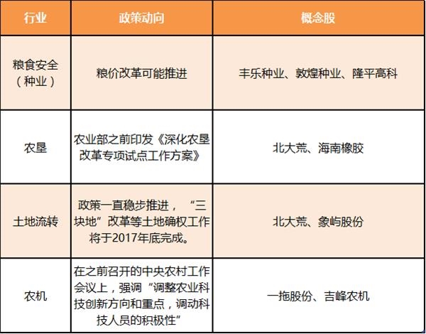 受中央一号文件利好,每年年初农业板块均有所表现,地方两会也陆续开始布局2017年农业供给侧改革,甘肃、新疆等省份在政府工作报告中提及,农业是2017年供给侧改革的重中之重,农业在双重利好下有望迎来布局时机,或引发今年大行情。